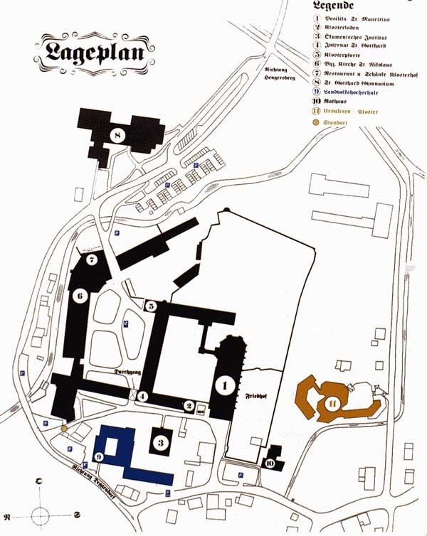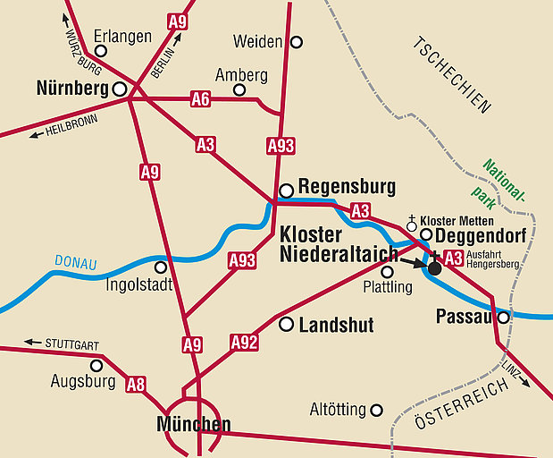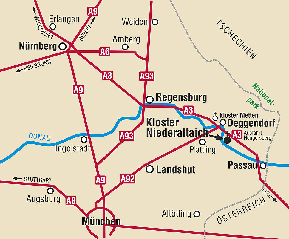 Niederaltaich is situated on the Danube (the north bank), some 10 kilometers from Deggendorf, on the Autobahn A3, Exit 111 (Hengersberg-Niederaltaich). Turn left as you emerge from the exit, then turn right.