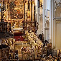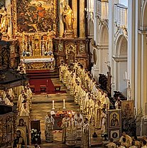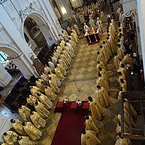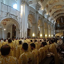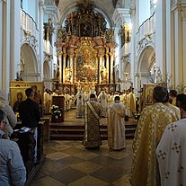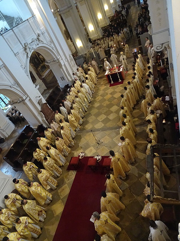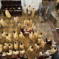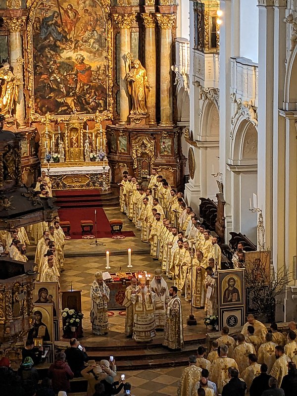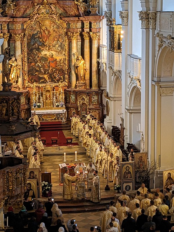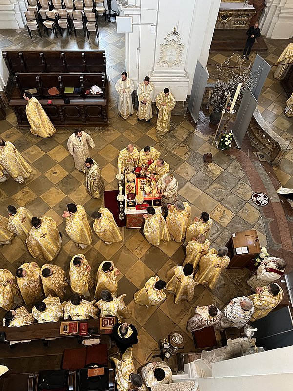 Die Göttliche Liturgie wurde am Samstagmorgen in der Basilika des Klosters gefeiert, damit aller Priester und Diakone konzelebrieren konnten. Danach kamen über 200 Pfarrverantwortliche und Delegierte zur Versammlung der Erzdiözese in der Aula unseres Gymnasium zusammen zur Vorstellung der Tätigkeitsberichte für das Jahr 2022 sowie der weiteren Arbeitspunkte der Diözesanversammlung.