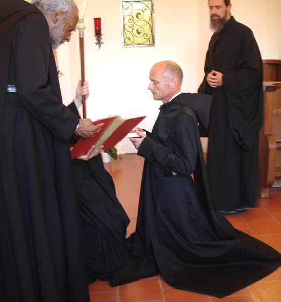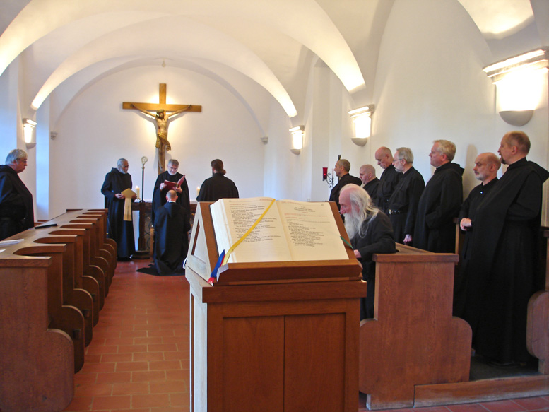 Vor der Komplet am Sonntagabend, dem 12. Juni, wurde Frater Eckhart mit dem Ritus der Einkleidung ins Noviziat aufgenommen. Aus der Hand von Abt Marianus empfing er den Mönchs-Habit – der erste übrigens seit Jahrzehnten, den nicht unser Schneider fr. Markus anfertigen konnte, wegen seines nachlassenden Augenlichts.