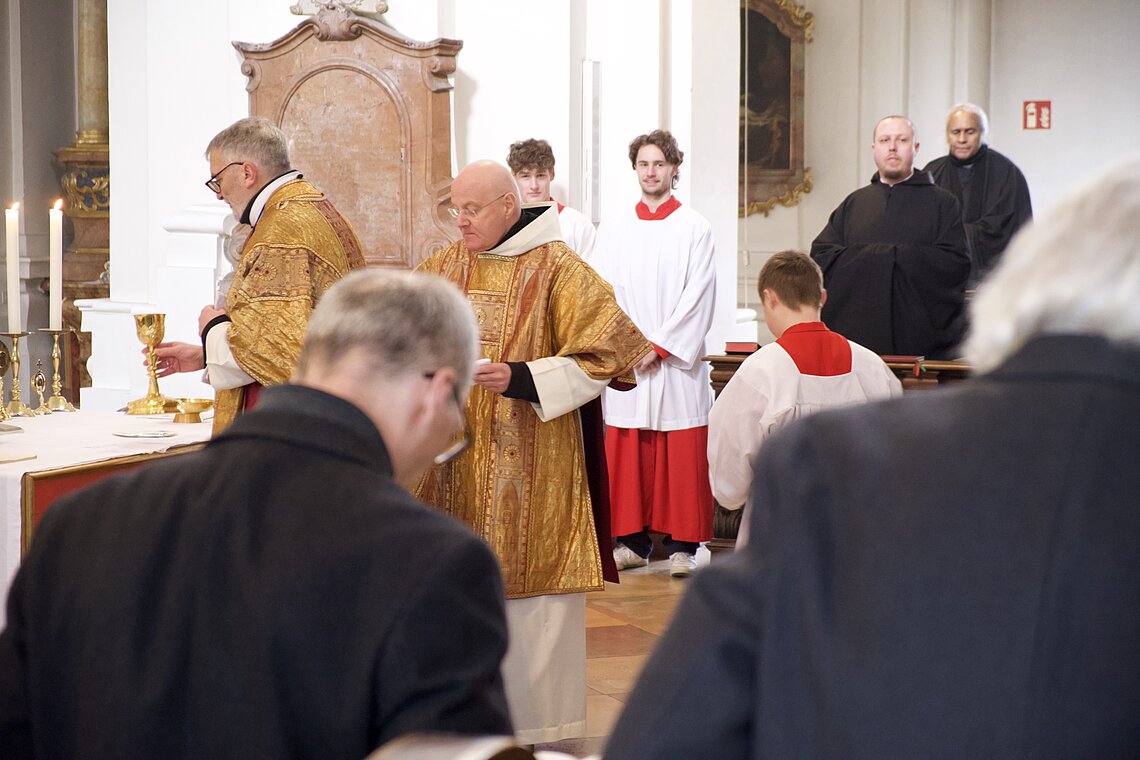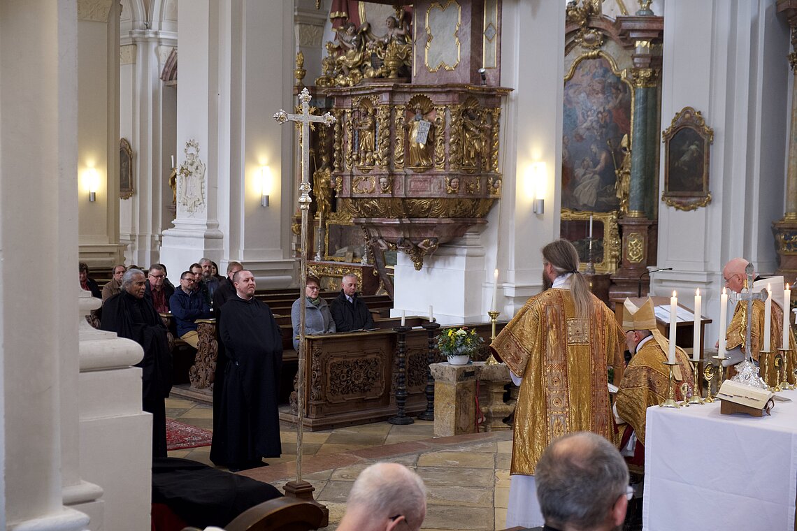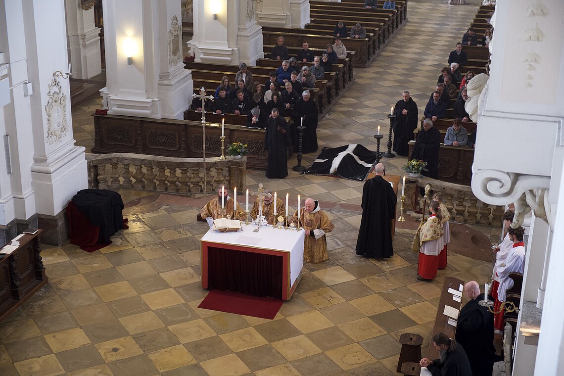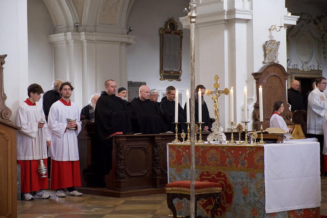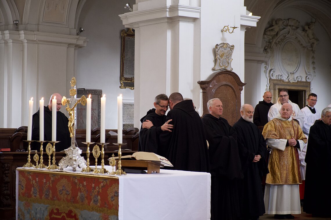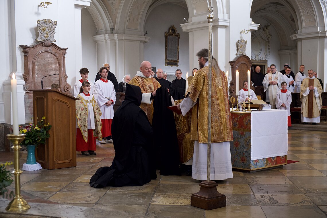 Fr. Benedikt Maria Haiduk OSB hat seine Ewige Profess am Benediktsfest, dem 21. März, in unserer Basilika vor Abt Marianus und der Bruderschaft im Rahmen einer Heiligen Messe abgelegt. Wie Frater Serafim im Oktober wählte auch er den eindringlichen alten Prefess-Ritus der Lebenshingabe mit schwarzem Bahrtuch, Totenglocke und -wache. Abt Marianus nahm in seiner Ansprache Bezug auf Abraham, der sein Land verließ, um Gottes Verheißung zu folgen. An den Gottesdienst schloss sich ein gemeinsames Mahl im Refektorium an.
