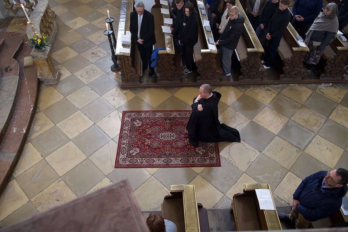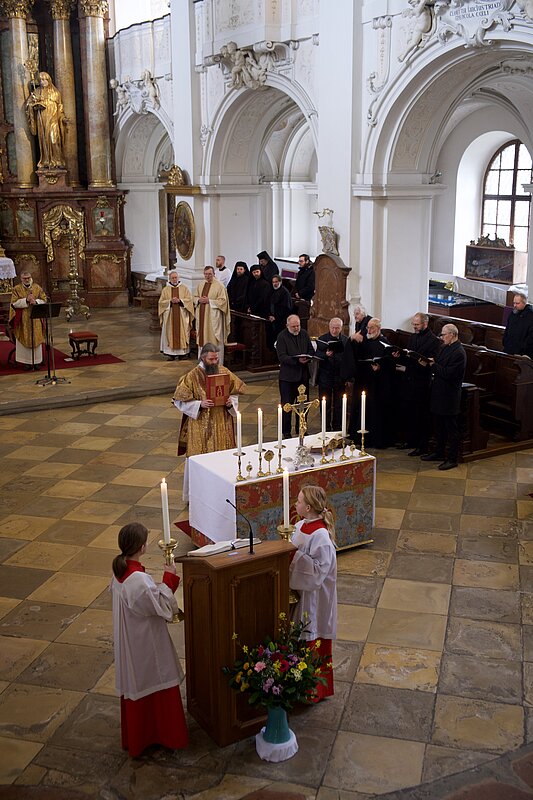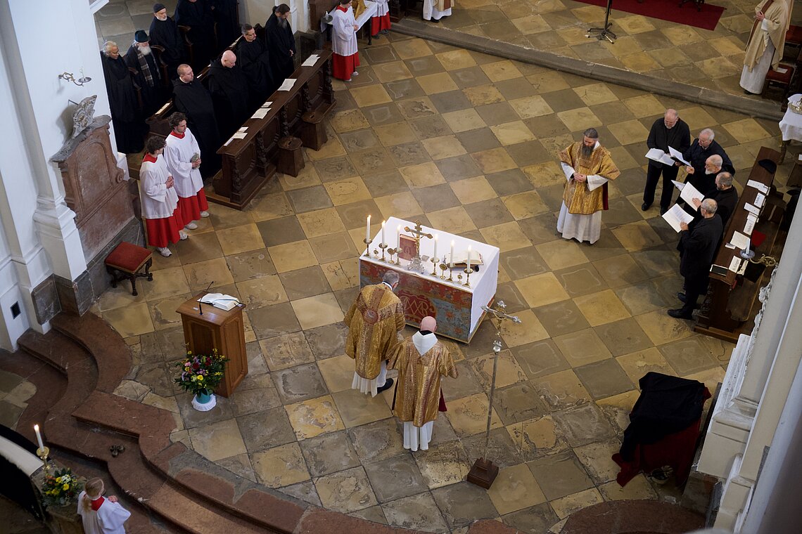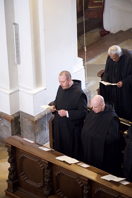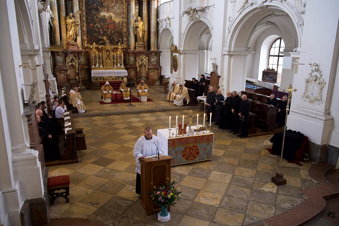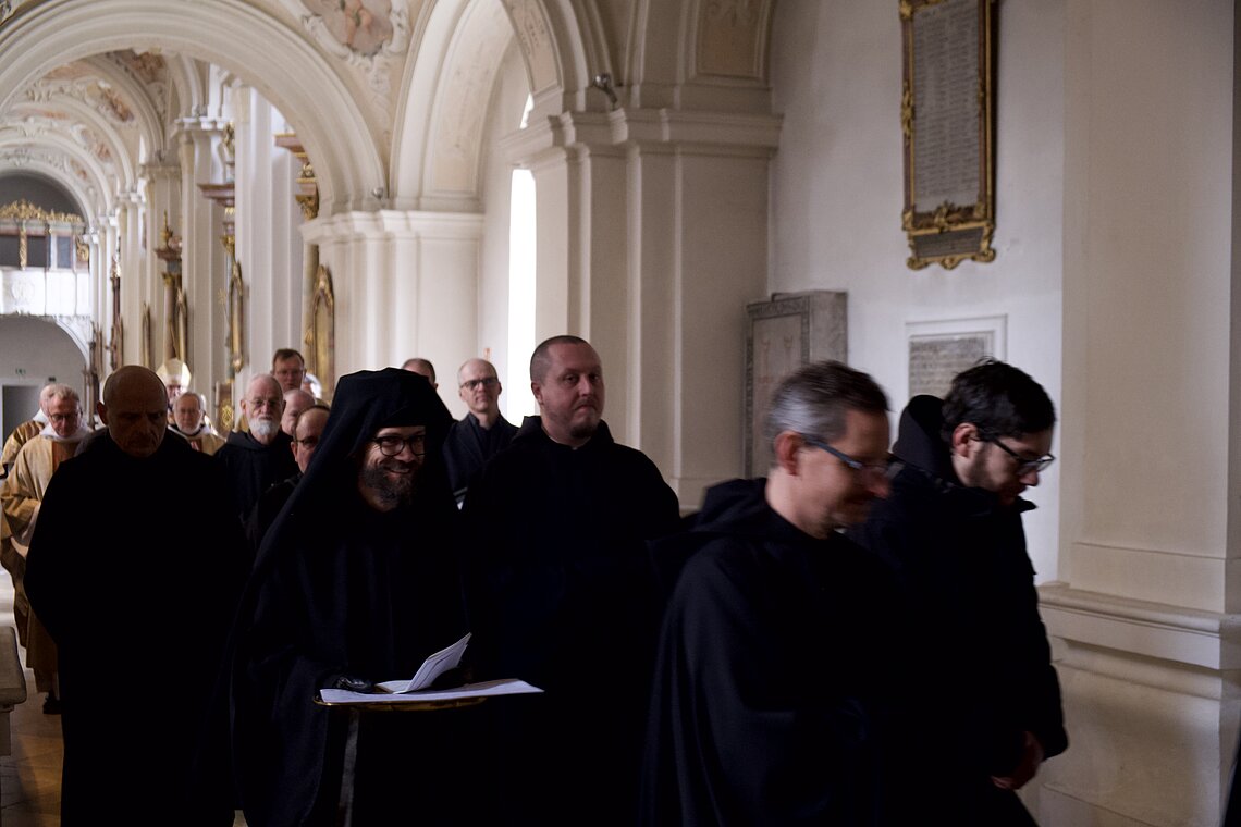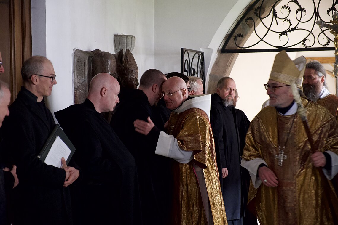 Fr. Benedikt Maria Haiduk OSB hat seine Ewige Profess am Benediktsfest, dem 21. März, in unserer Basilika vor Abt Marianus und der Bruderschaft im Rahmen einer Heiligen Messe abgelegt. Wie Frater Serafim im Oktober wählte auch er den eindringlichen alten Prefess-Ritus der Lebenshingabe mit schwarzem Bahrtuch, Totenglocke und -wache. Abt Marianus nahm in seiner Ansprache Bezug auf Abraham, der sein Land verließ, um Gottes Verheißung zu folgen. An den Gottesdienst schloss sich ein gemeinsames Mahl im Refektorium an.