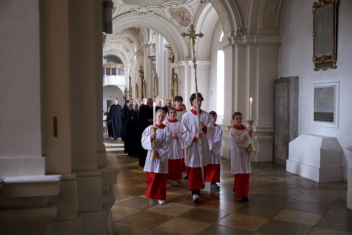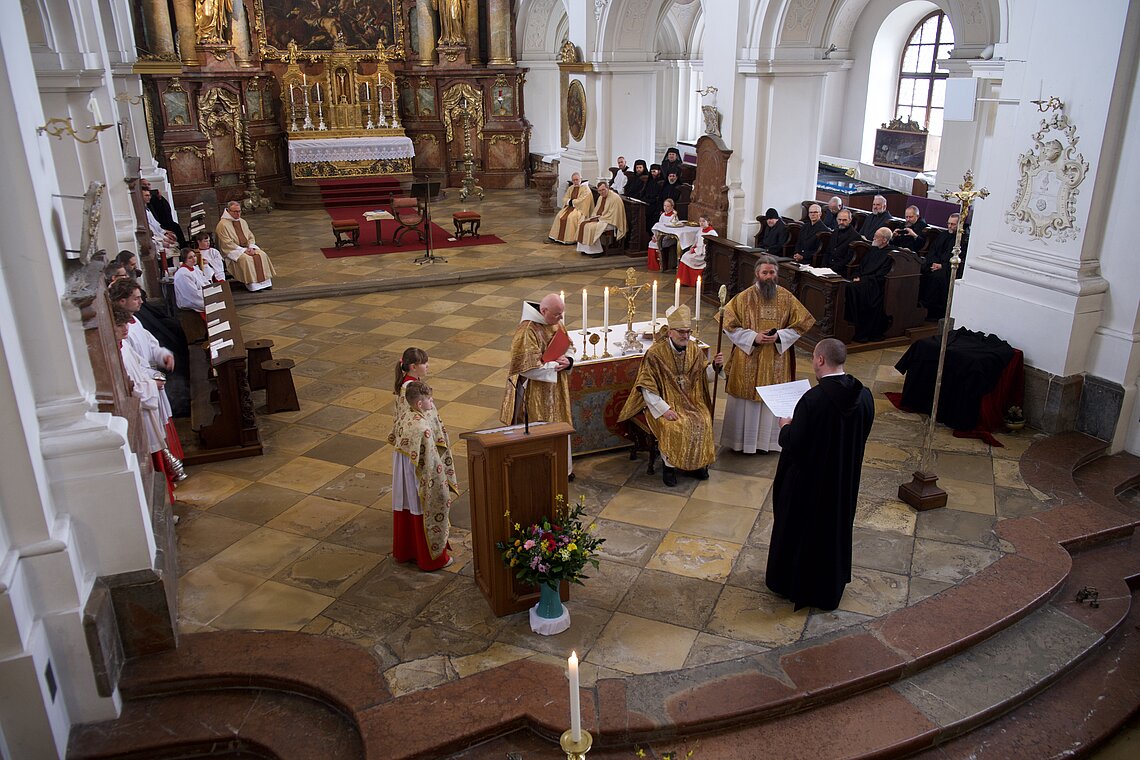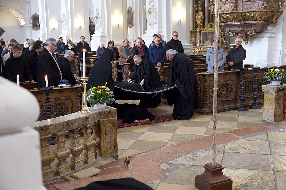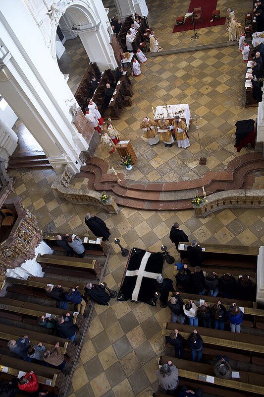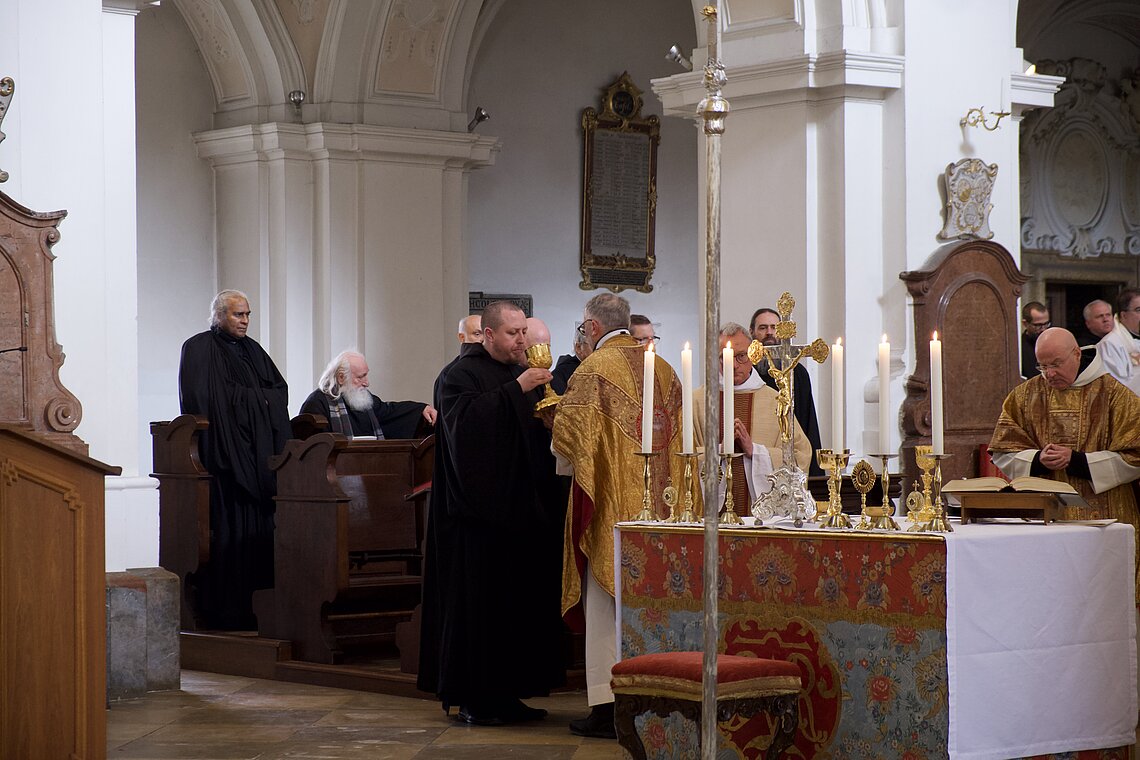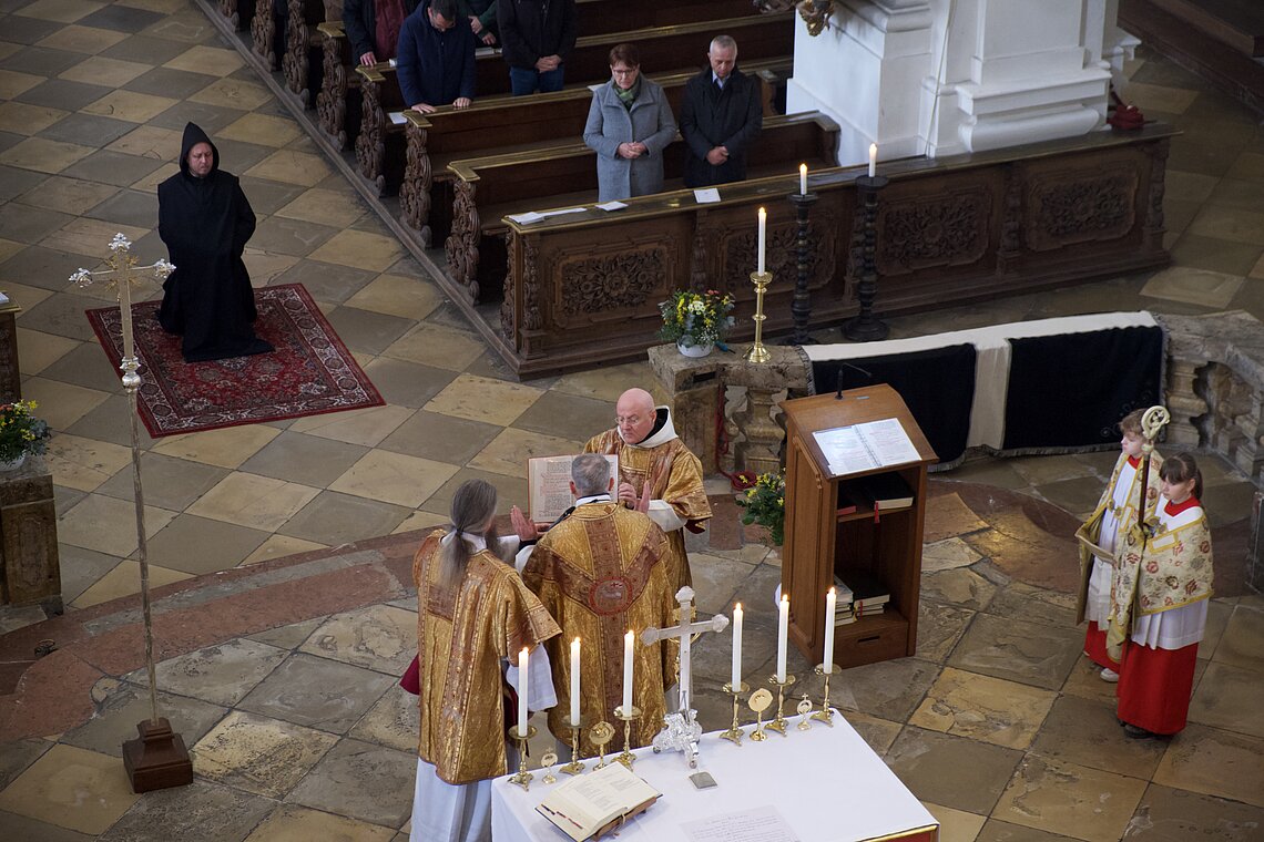 Fr. Benedikt Maria Haiduk OSB hat seine Ewige Profess am Benediktsfest, dem 21. März, in unserer Basilika vor Abt Marianus und der Bruderschaft im Rahmen einer Heiligen Messe abgelegt. Wie Frater Serafim im Oktober wählte auch er den eindringlichen alten Prefess-Ritus der Lebenshingabe mit schwarzem Bahrtuch, Totenglocke und -wache. Abt Marianus nahm in seiner Ansprache Bezug auf Abraham, der sein Land verließ, um Gottes Verheißung zu folgen. An den Gottesdienst schloss sich ein gemeinsames Mahl im Refektorium an.