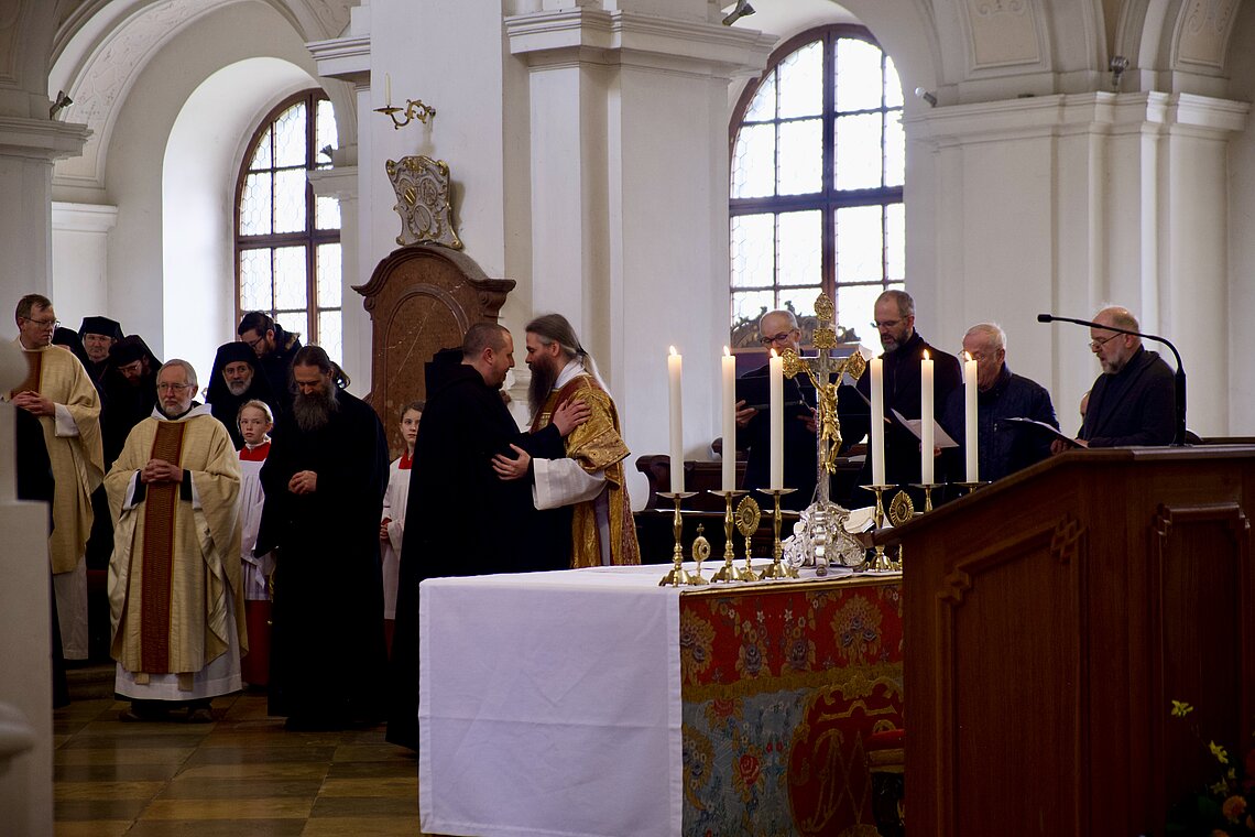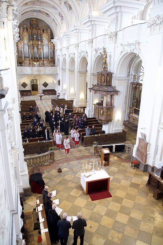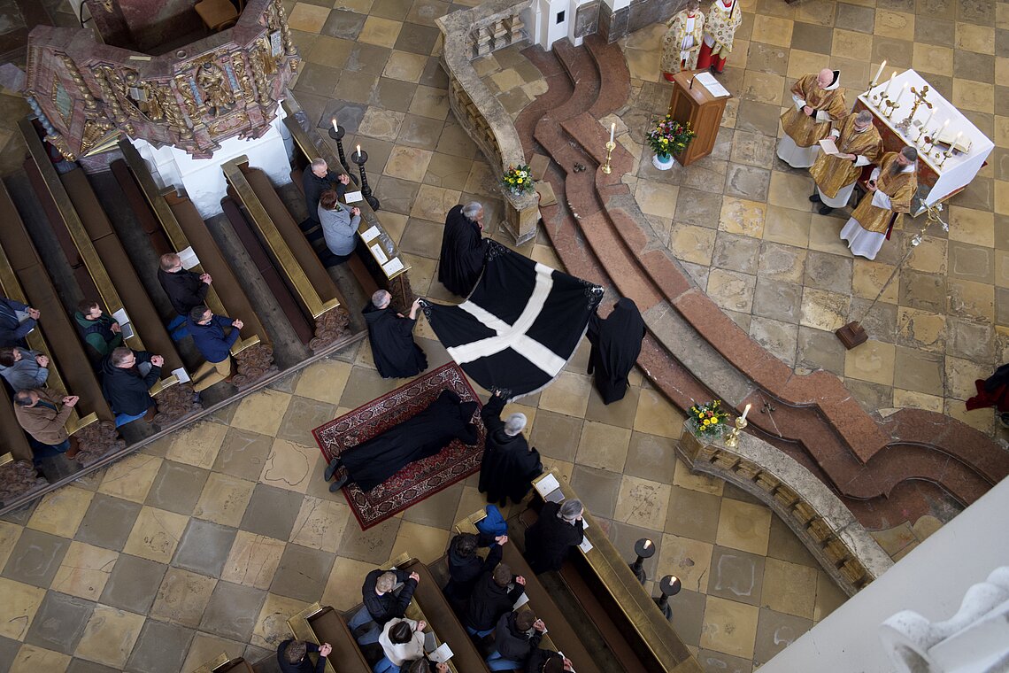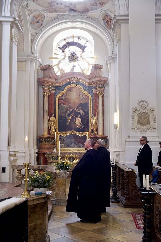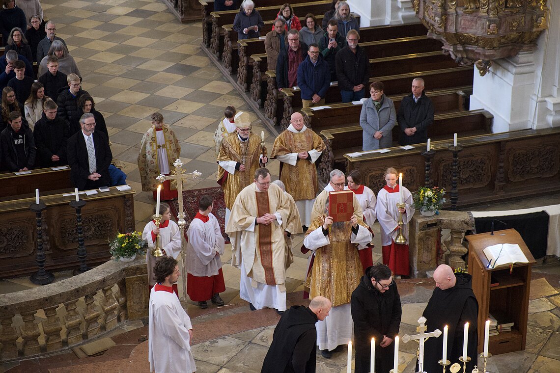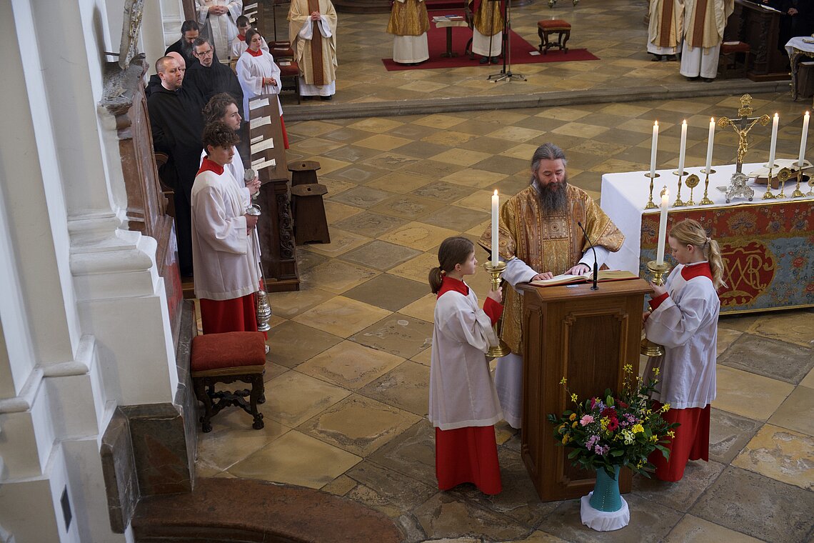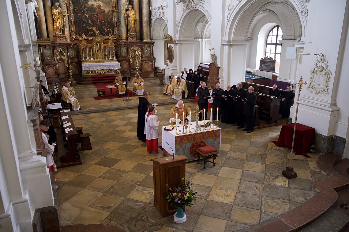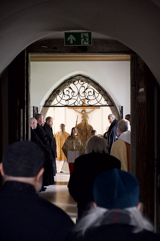 Fr. Benedikt Maria Haiduk OSB hat seine Ewige Profess am Benediktsfest, dem 21. März, in unserer Basilika vor Abt Marianus und der Bruderschaft im Rahmen einer Heiligen Messe abgelegt. Wie Frater Serafim im Oktober wählte auch er den eindringlichen alten Prefess-Ritus der Lebenshingabe mit schwarzem Bahrtuch, Totenglocke und -wache. Abt Marianus nahm in seiner Ansprache Bezug auf Abraham, der sein Land verließ, um Gottes Verheißung zu folgen. An den Gottesdienst schloss sich ein gemeinsames Mahl im Refektorium an.