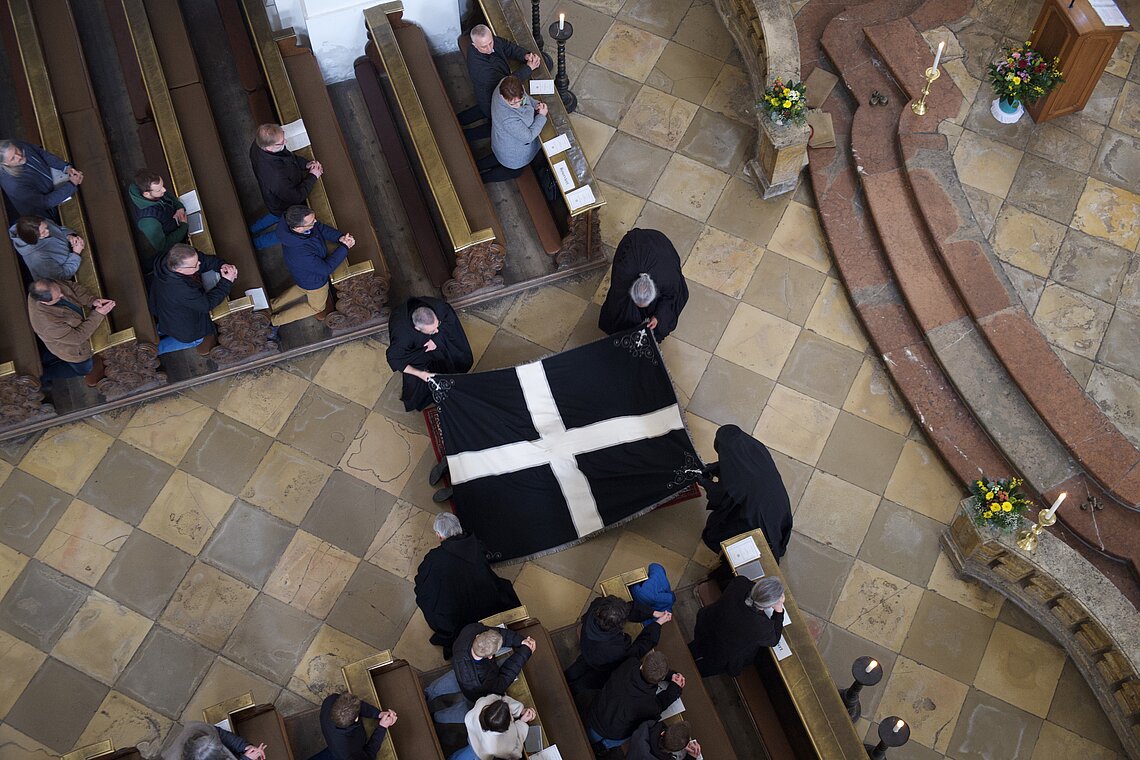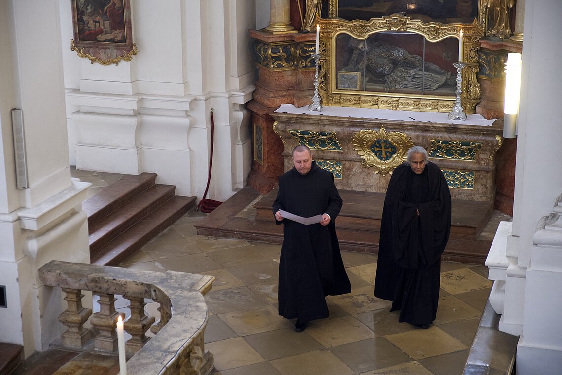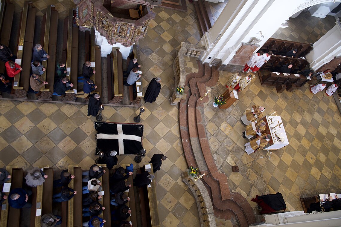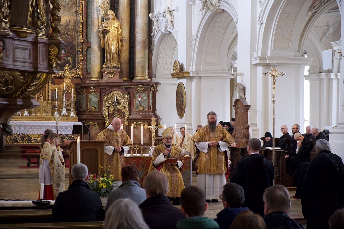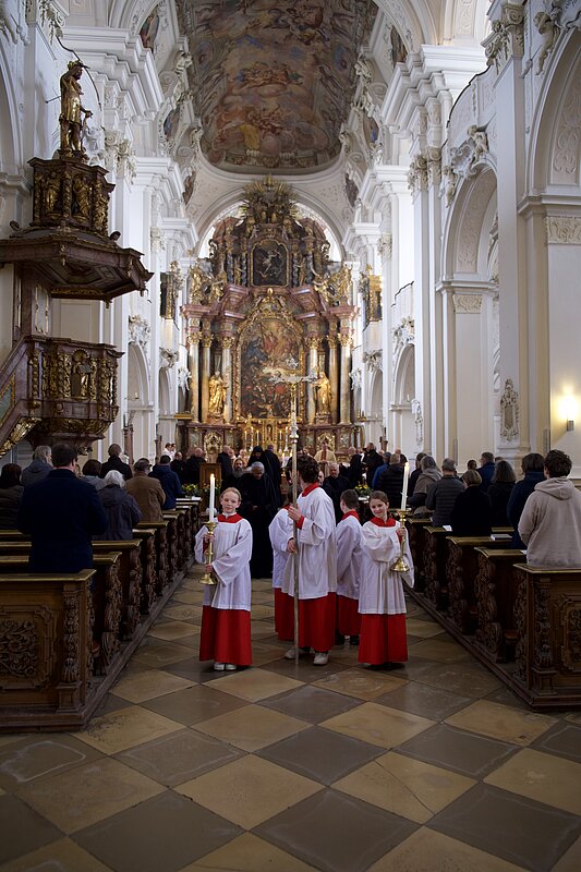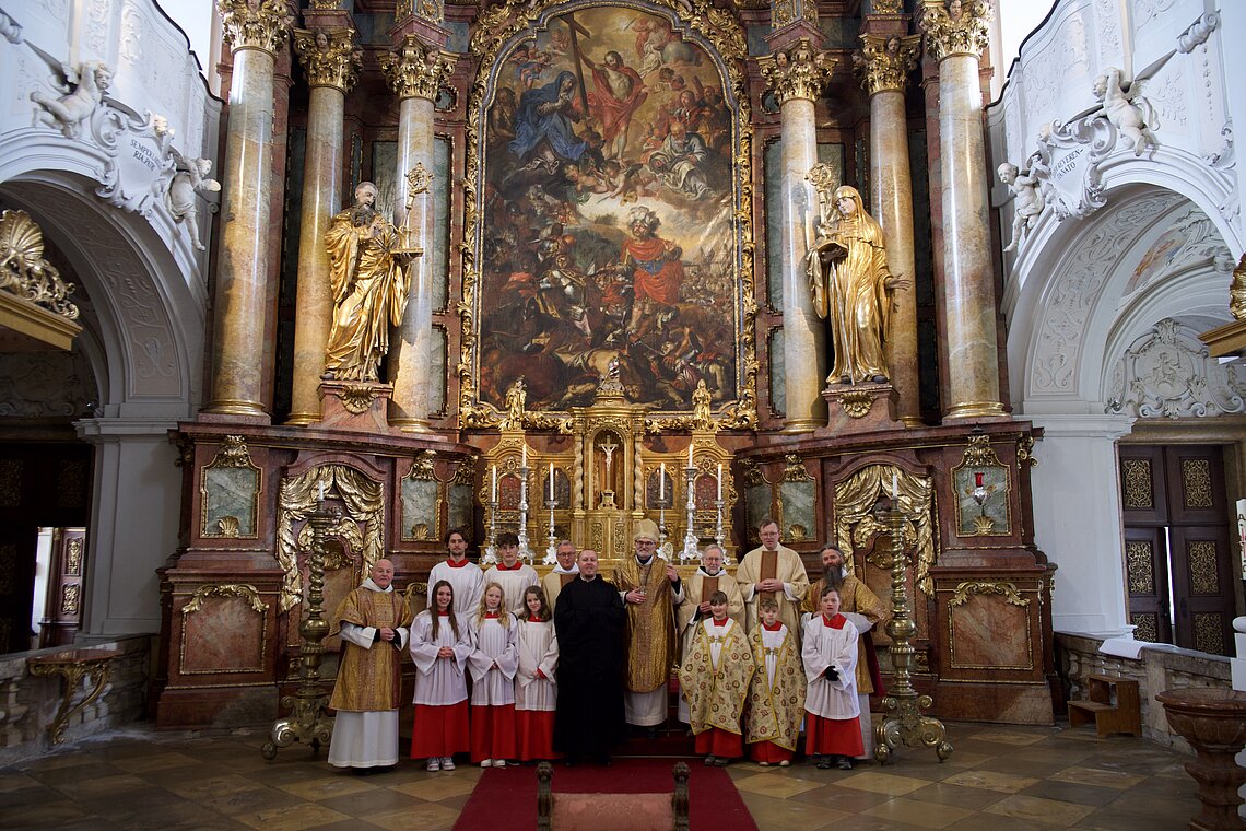 Fr. Benedikt Maria Haiduk OSB hat seine Ewige Profess am Benediktsfest, dem 21. März, in unserer Basilika vor Abt Marianus und der Bruderschaft im Rahmen einer Heiligen Messe abgelegt. Wie Frater Serafim im Oktober wählte auch er den eindringlichen alten Prefess-Ritus der Lebenshingabe mit schwarzem Bahrtuch, Totenglocke und -wache. Abt Marianus nahm in seiner Ansprache Bezug auf Abraham, der sein Land verließ, um Gottes Verheißung zu folgen. An den Gottesdienst schloss sich ein gemeinsames Mahl im Refektorium an.