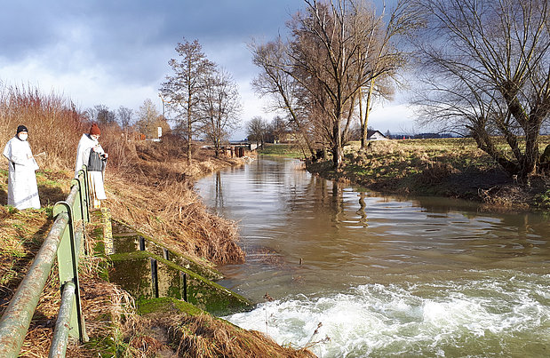 Angekommen am Fluss, inzensiert Abt Marianus die Wasser.
