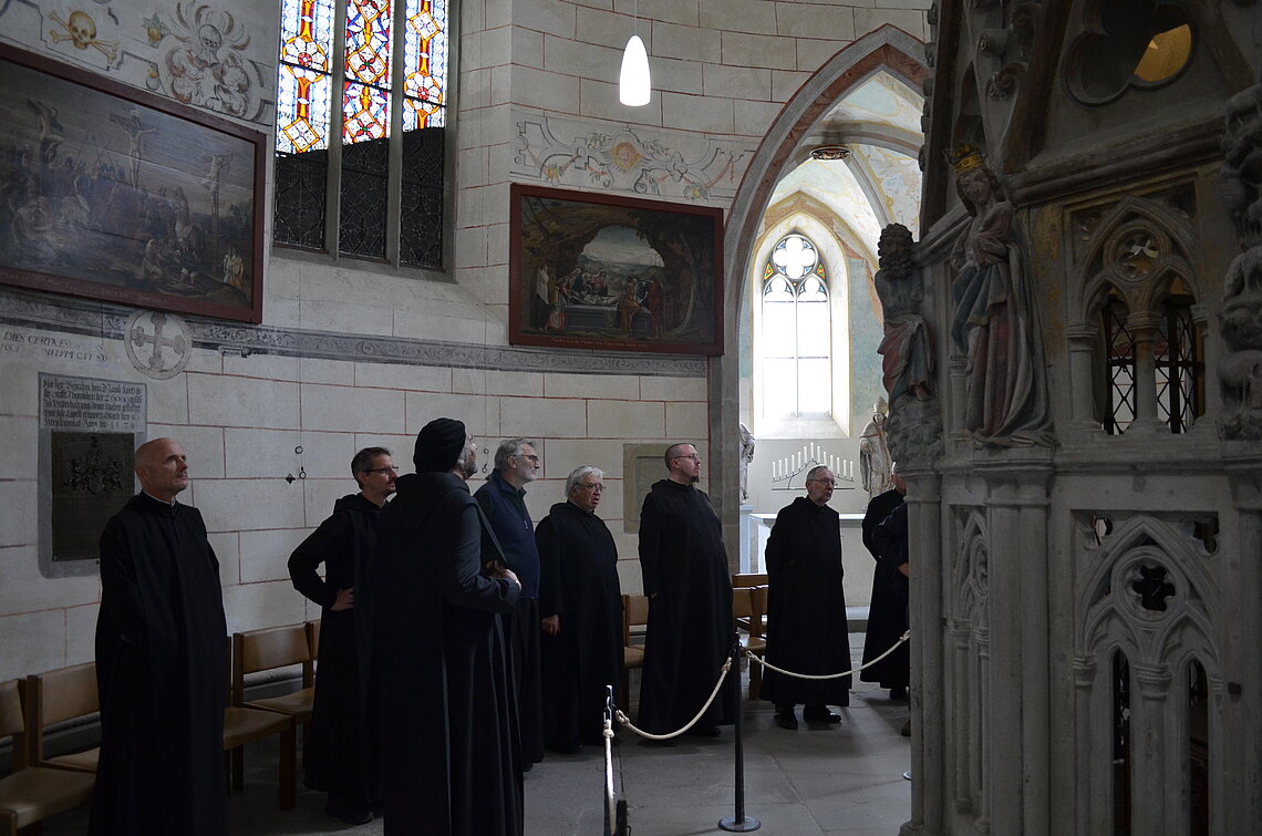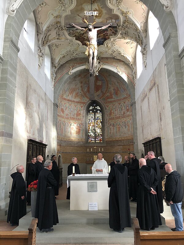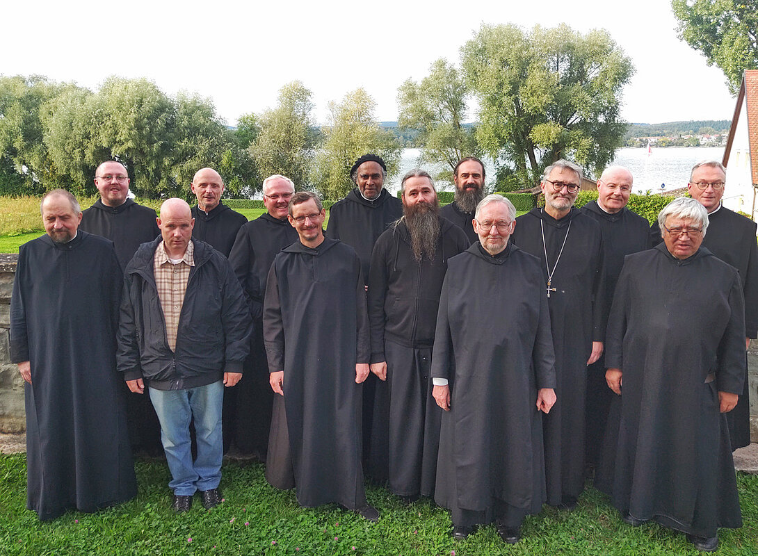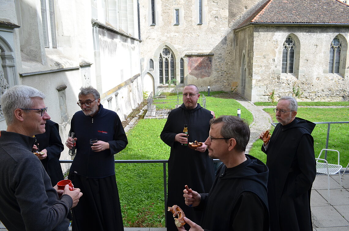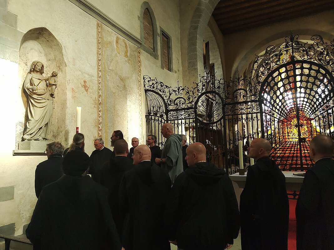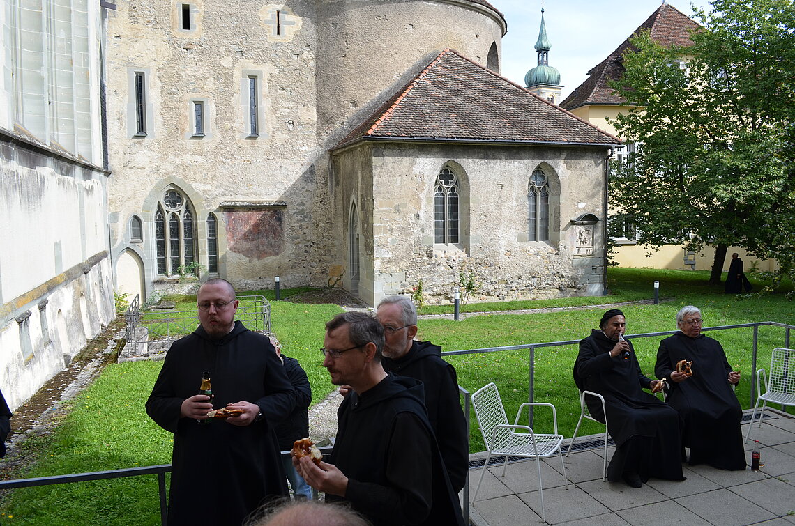 Anlass war u.a. die Landesausstellung "Welterbe des Mittelalters – 1300 Jahre Klosterinsel Reichenau" im Archäologischen Landesmuseum Baden-Württemberg in Konstanz mit Leihgaben auch aus unserer Abtei (daher: freier Eintritt für uns). Da ein solcher Besuch der Ausstellung und der Klosterinsel mit ihren drei Kirchen ohne Übernachtung kaum möglich ist, haben wir unseren Konventausflug, der ja wegen Corona die letzten Jahre ausfallen musste, entsprechend verlängert und zu einer Pilgerfahrt auch zu unseren "ideellen Wurzeln" gestaltet.