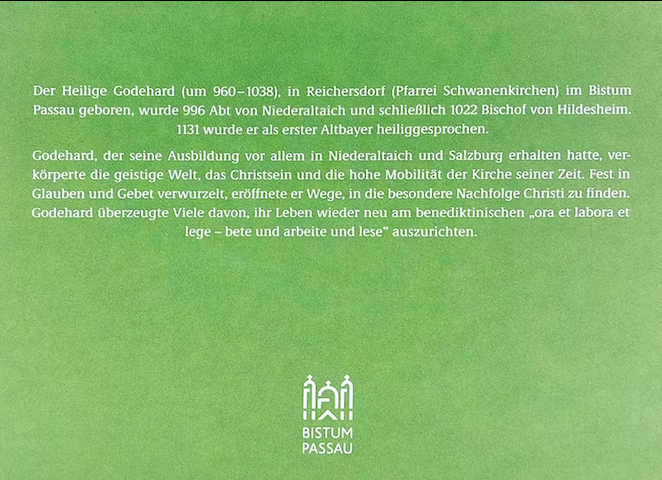 Gotthard, Abt von Niederaltaich und Bischof von Hildesheim, gehört zu den bedeutendsten Heiligen des Mittelalters. Aus Anlass seiner Bischofsweihe vor 1.000 Jahren erinnert das Bistum Hildesheim an den außergewöhnlichen Seelsorger mit einem Jubiläumsjahr unter dem Motto: “Glauben geht. Go!” Das Godehardjahr soll nicht zuletzt der inneren Erneuerung des Glaubens und des Bistums dienen.