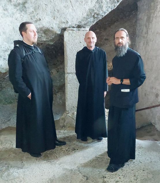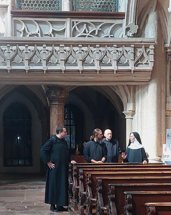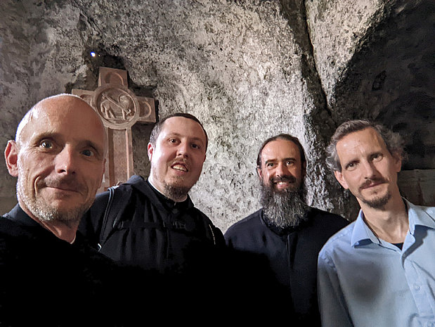 Mit den zahlreichen und unterschiedlichen Eindrücken begab sich die Gruppe dann in die sogenannten Katakomben, die jedoch nicht wie in Rom unterirdisch, sondern dem Himmel ein Stück näher, in der Felswand bei der Abtei angelegt sind. Dort ehrten wir die Gottesmutter mit dem Salve Regina und genossen anschließend im Cafe Bazar, direkt an der Salzach gelegen, eine Melange und Topfenstrudel. Den Abschluss des Tages begingen wir dann wieder auf dem Nonnberg, wo wir der Komplet der Schwestern lauschten und sowohl die romanischen Fresken als auch die Krypta der Abteikirche bewundern konnten. So fand unser Noviziatsausflug 2022 ein gelungenes Ende und wir kehrten mit vielen verschiedenen Eindrücken aus Salzburg nach Niederaltaich zurück.