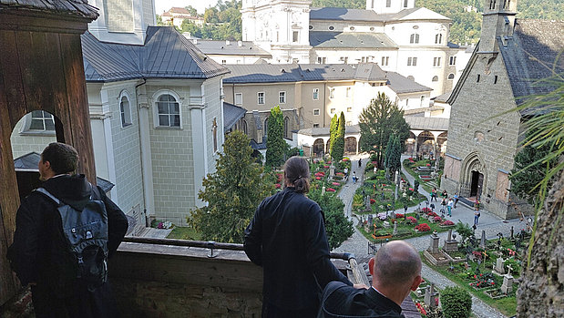 Nach dem Aufstieg zum Nonnberg musste auch der Abstieg nach St. Peter, unserer zweiten Station, erfolgen, doch auch dies war durchaus nicht weniger erhebend. Erzabt Korbinian Birnbacher nahm sich ebenfalls viel Zeit für uns und führte mit Expertise und Humor durch die Klosteranlage des Ende des 7. Jahrhunderts gegründeten Klosters. Anschließend folgte das Mittagsgebet in der Marienkapelle und das gemeinsame Mittagessen mit den Mönchen im Refektorium. Schon beim Essen und auch danach kamen wir mit einigen Mönchen ins Gespräch, die uns, wie in Österreich üblich, sogleich das Du angeboten haben. Nach einem Digestif im ausgedehnten Prälatentrakt fand der Nachmittag seinen vorläufigen Abschluss im sogenannten DomQuartier, einem Museumskomplex, durch den uns der Erzabt höchstpersönlich geführt hat. Neben großen, barocken Empfangsräumen der Fürstbischöfe und einer sehr ansprechenden und gelungenen Ausstellung zur Erzabtei St. Peter, gab es dort auch allerhand Kurioses zu entdecken: von einer eucharistischen Taube (Peristerium) aus Limoges bis hin zu ausgestopften Äffchen und unter der Decke schwebenden, präparierten Fischen war für jeden etwas dabei.