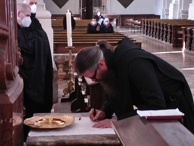 Die eigenhändig geschriebene Urkunde wird während der Professfeier unterschrieben.