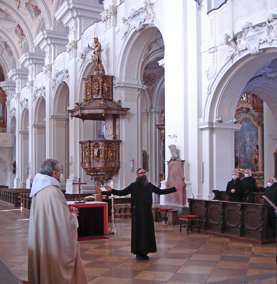 Abt Marianus hat in seiner Predigt vom Weg zu Gott gesprochen, der kein Ausflug ist, keine Exkursion, nach der man wieder "nach Hause" zurückkehrt, sonder wie bei Abraham und Benedikt geht es darum, die Heimat zu verlassen und immer weiter zu gehen - ins "gelobte Land". Hier überreicht er die hl. Regel des großen Gottsuchers Benedikt.