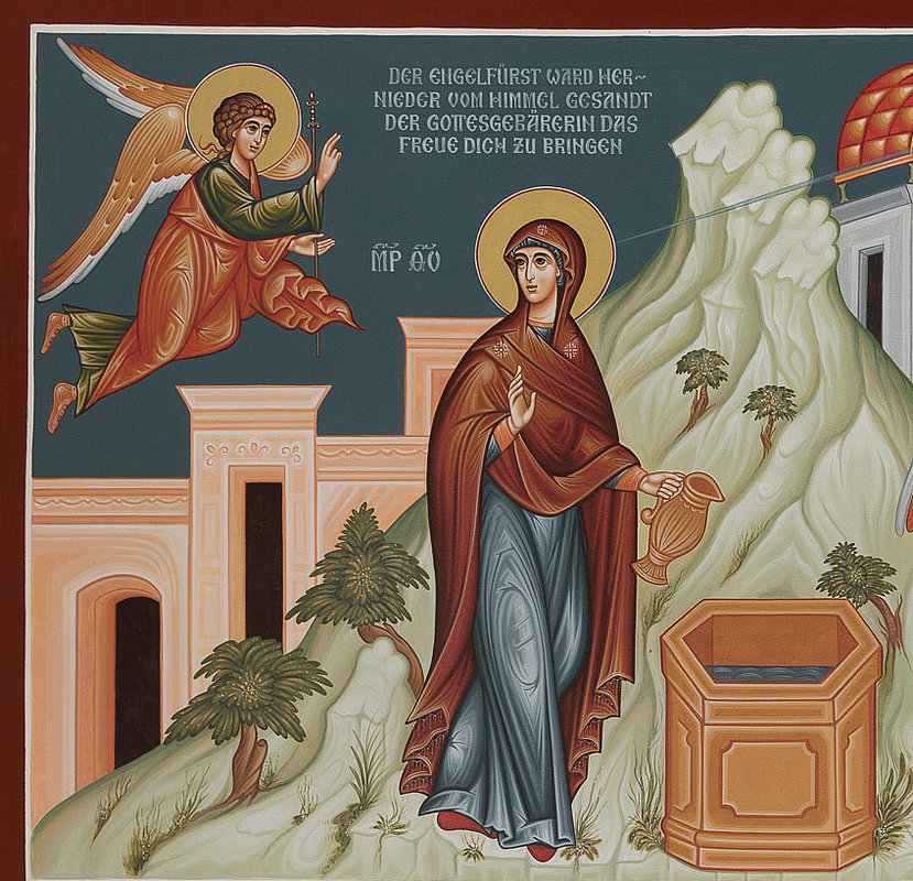 Der Engel Fürst ward hernieder vom Himmel gesandt, der Gottesgebärerin das „Freue dich“ zu bringen. Und als er sah, wie Du, o Herr, beim Klang seiner körperlosen Stimme einen Leib annahmst, da erschauerte er und erstarrte und rief ihr diese Worte zu:
