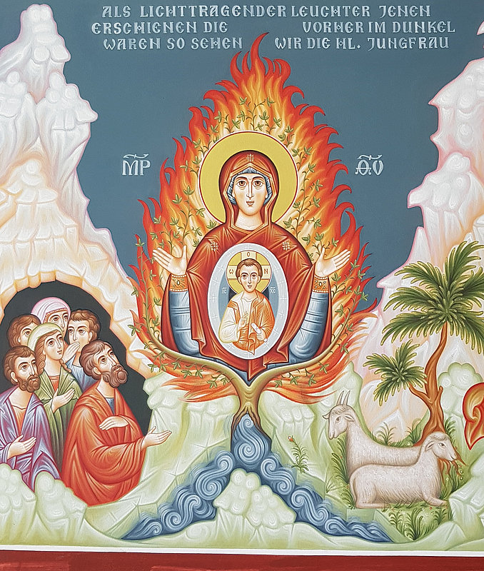 Als licht-tragender Leuchter, jenen erschienen, die vorher im Dunkel waren, so sehen wir die hl. Jungfrau; denn seit sie das stofflose Licht in sich aufnahm, zeigt sie allen den Weg zur Gotterkenntnis, erleuchtet mit ihrem Licht unsern Sinn und wird durch unser Rufen also verehrt: