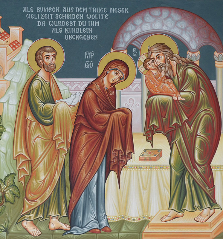 Die Szene basiert auf dem Lukas-Ev. 2,22-40 und ist auch das Motiv der Festtagsikone beim Hochfest Begegnung unseres Herrn, Gottes und Erlösers Jesus Christus (am 2. Feb.) mit dem greisen Symeon im Tempel.