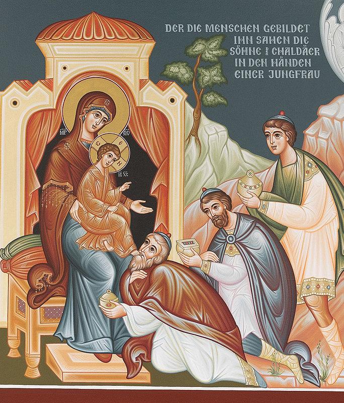 Der da mit Seinen Händen die Menschen gebildet, Ihn sahen die Söhne der Chaldäer in den Händen einer Jungfrau; doch sie erkannten Ihn als HERRN, auch wenn Er Knechtsgestalt angenommen, und sie beeilten sich, mit ihren Gaben Ihm zu dienen und der Gebenedeiten singend diese Worte zuzurufen:
