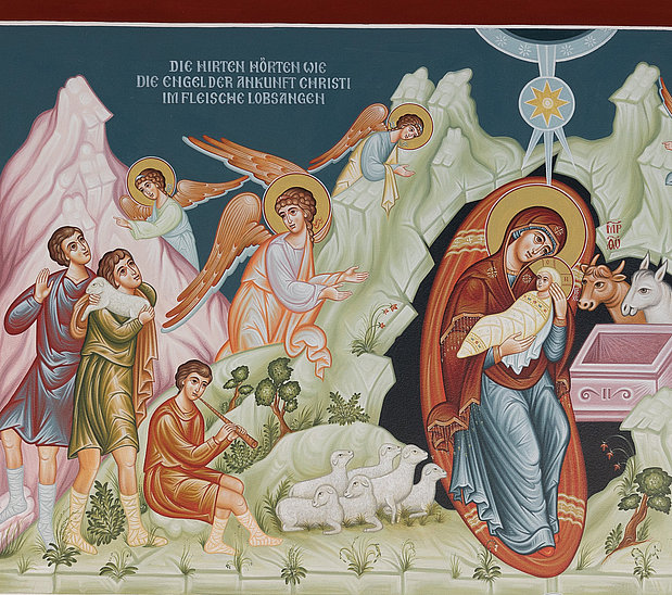 Die Hirten hörten, wie die Engel der Ankunft XCti im Fleische lobsangen; da liefen sie zu Ihm als zu ihrem eigenen Hirten und sahen Ihn als makelloses Lamm auf dem Schoße Mariens weiden. Da jubelten auch sie und riefen: